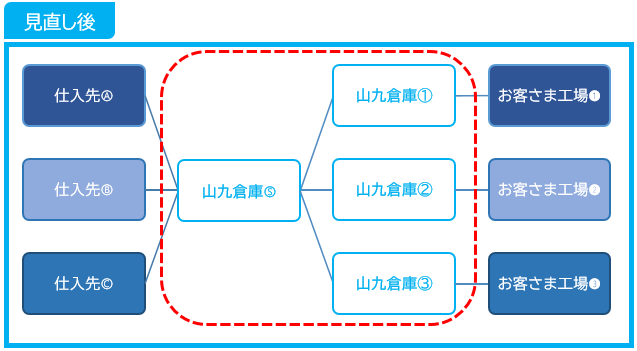 物流のワンストップ化(物流業者3社→1社、倉庫業者3社→1社)により、不要な物流コストが顕在化され、物流コストの適正化が実現。