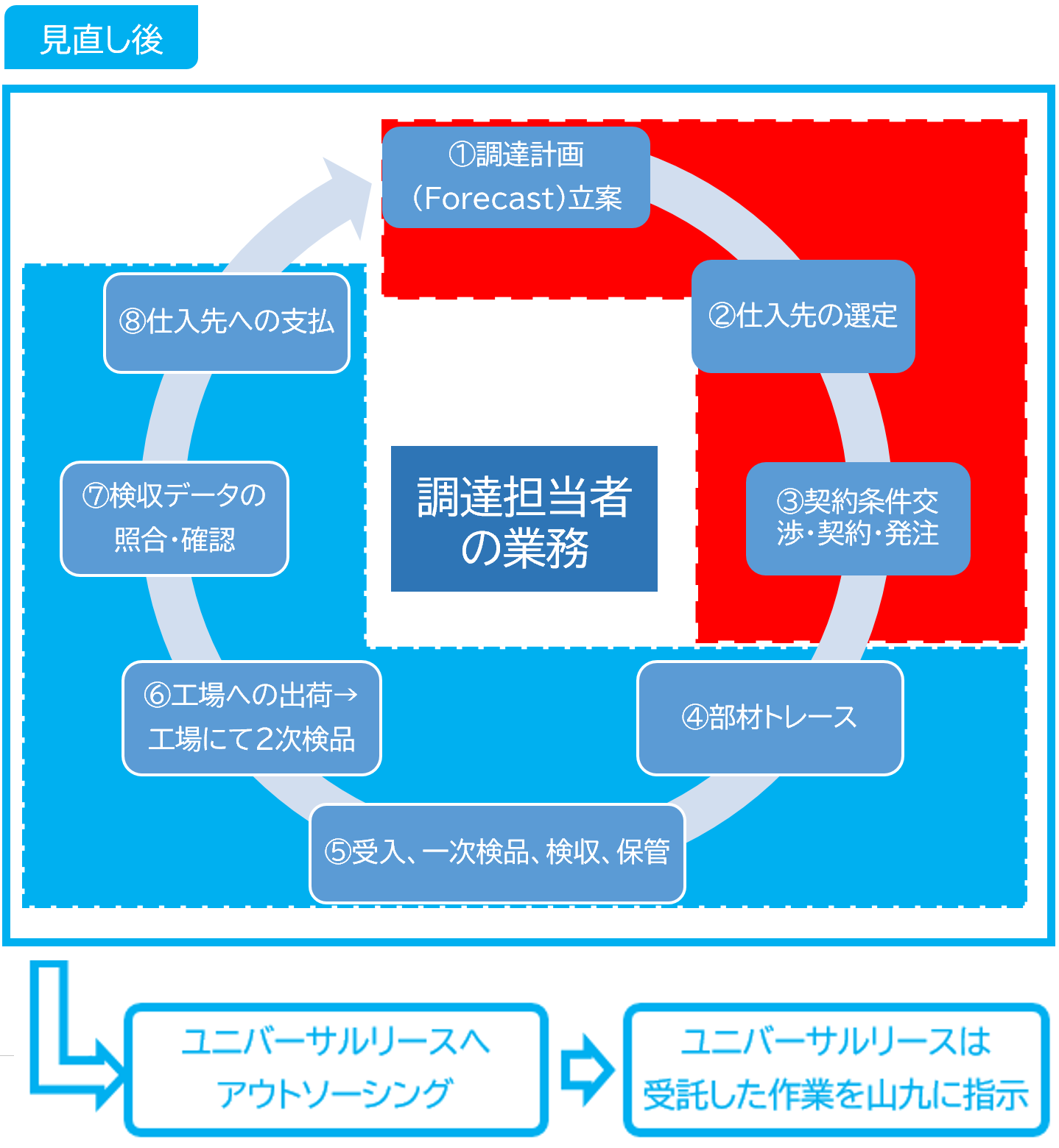 調達担当者としての主要業務①~③はこれまでどおりであるが、④~⑧の業務を外部委託することにより、人的リソースアロケーション(人財の適正配置)が可能に。