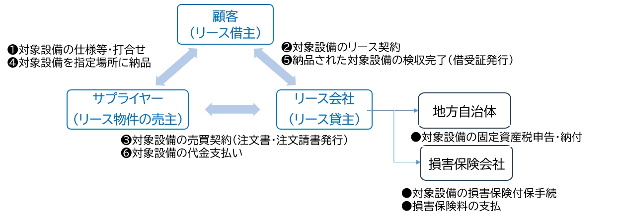 2.リース料の算出方法 対象設備の購入価額、リース期間中に発生する固定資産税と動産総合保険(損害保険)料、リ-ス会社の借入コストと収益の合計額を、リース料算出の計算基礎額として、リース期間中に亘り各月均等払いとなるように算出いたします。